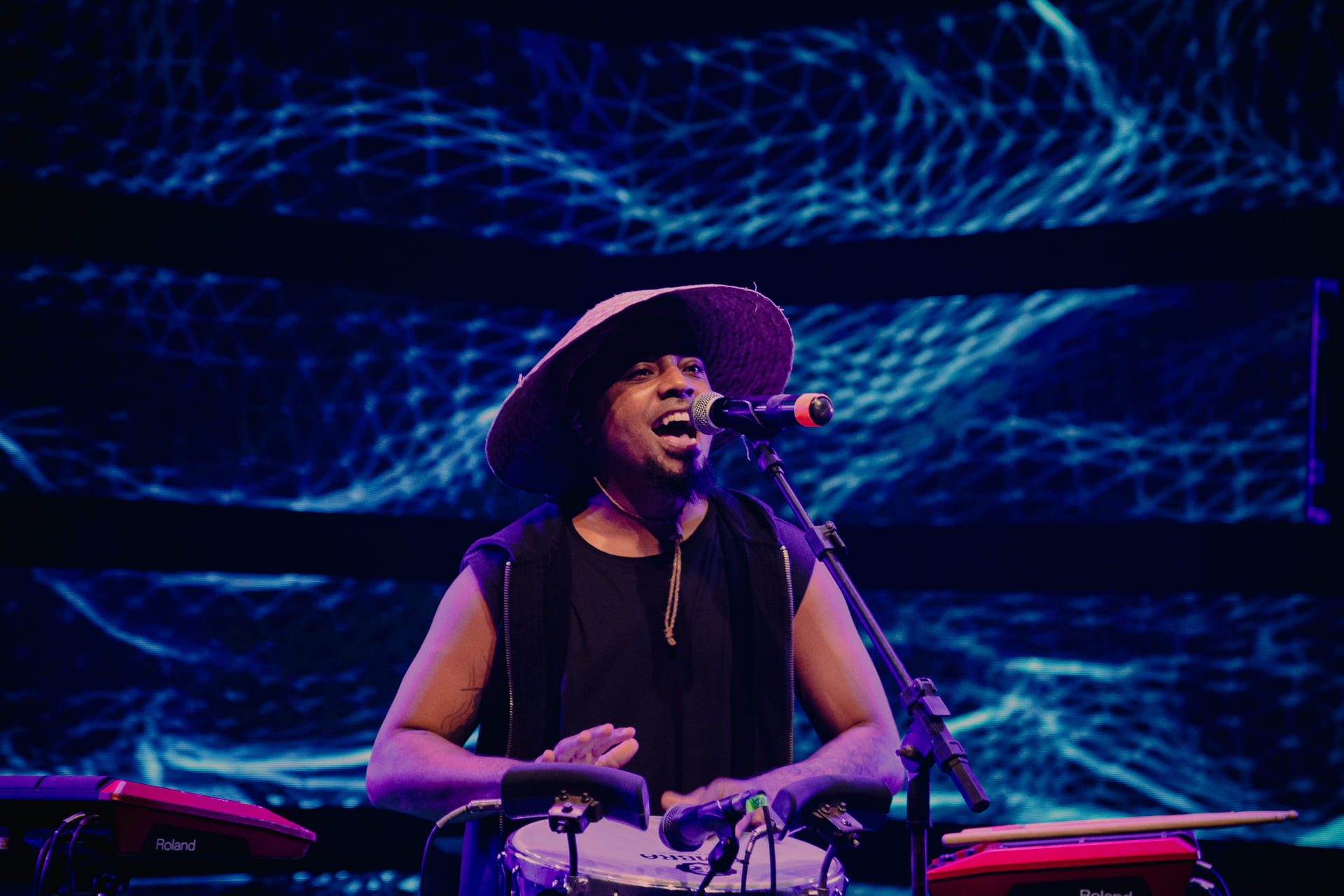 Essa combinação singular de instrumentos eletrônicos e orgânicos dá vida a uma sonoridade criativa, que incorpora tradições culturais como capoeira, candomblé, samba duro e samba de roda.